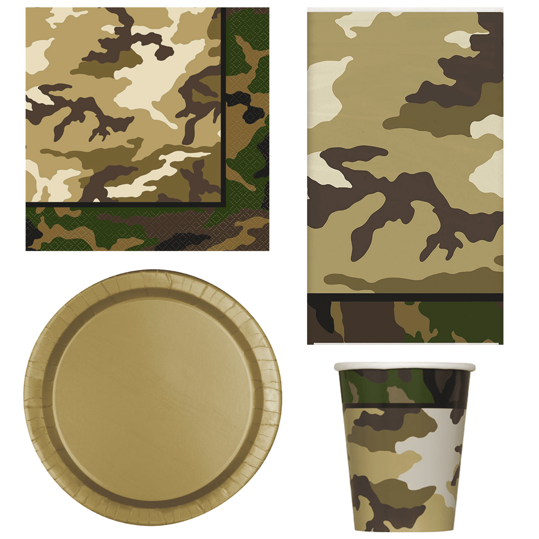 Get the troops attention with this army camouflage party pack. Including everything from plates, cups and napkins to a table cover and birthday party banner.
