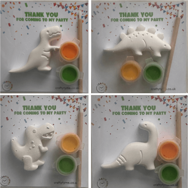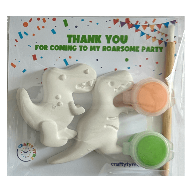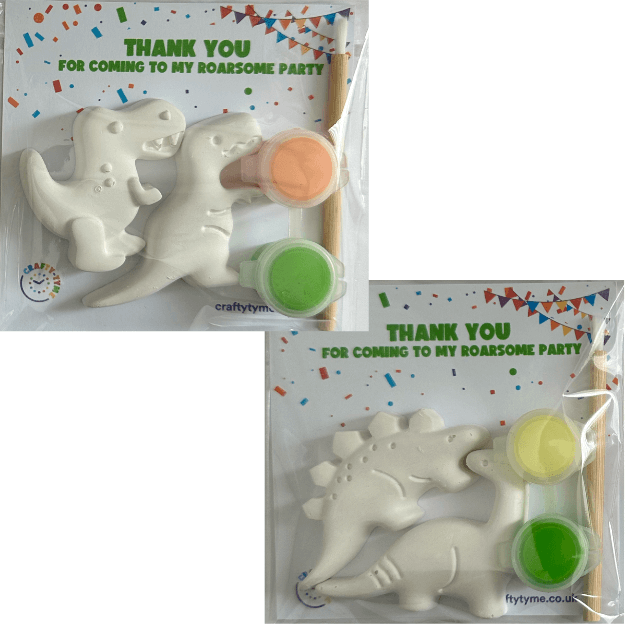 Give your guests a party bag with your own custom message. Each bag includes two assorted dinosaurs to paint, perfect for dinosaur-themed parties.