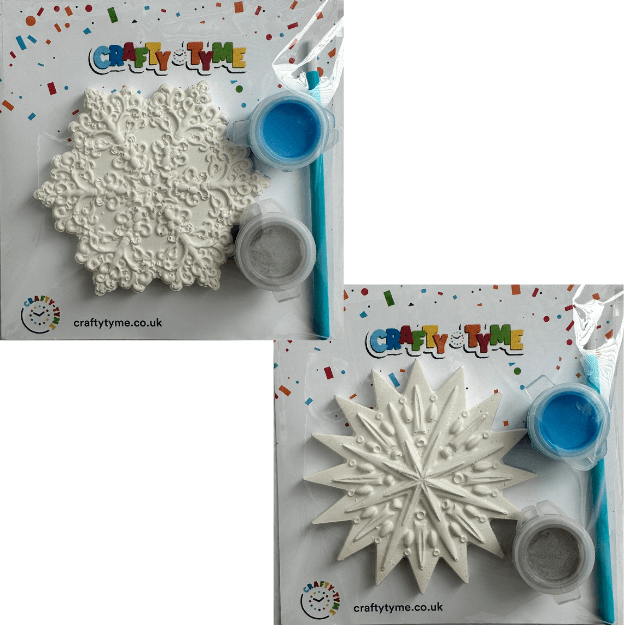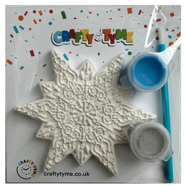 Give an enchanting frozen inspired paint kit. Each bag includes a beautiful large snowflake to paint, perfect for frozen lovers, Christmas or any occasion.