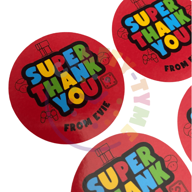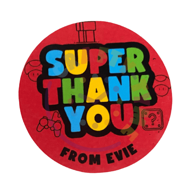 Thank your guests for coming to your party with these personalised super-kart birthday stickers. Great for securely sealing items in loot bags or finishing touch to sweet cones.