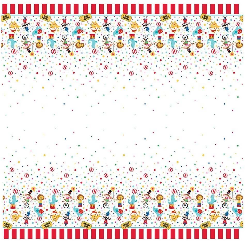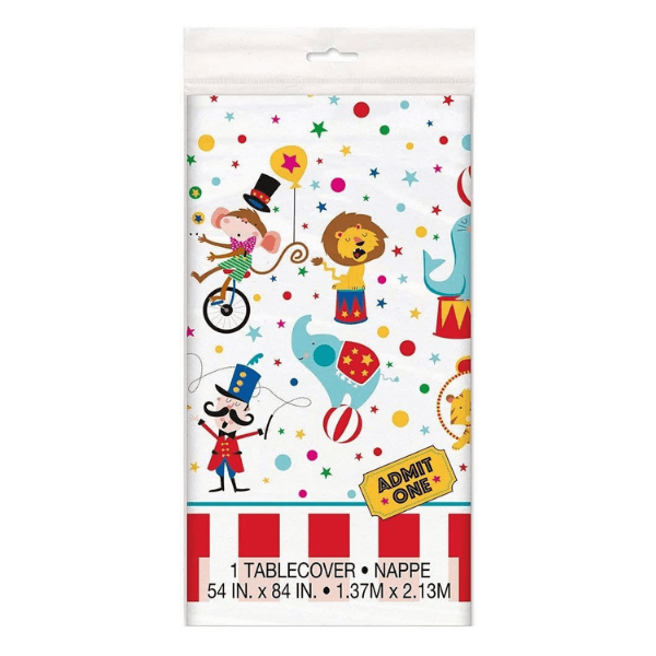 Bold colours and fun character table cover to bring the circus theme to your party venue.